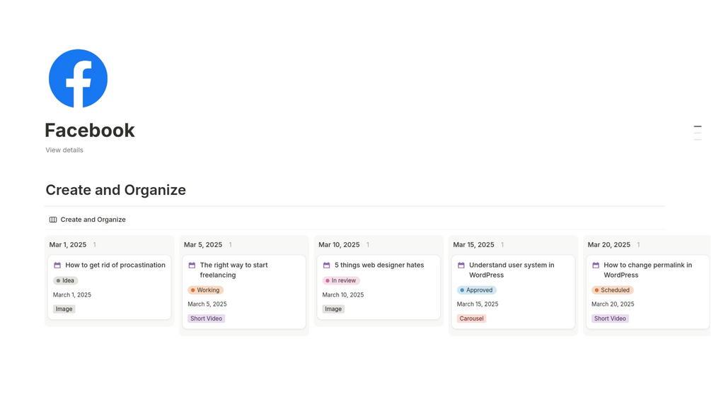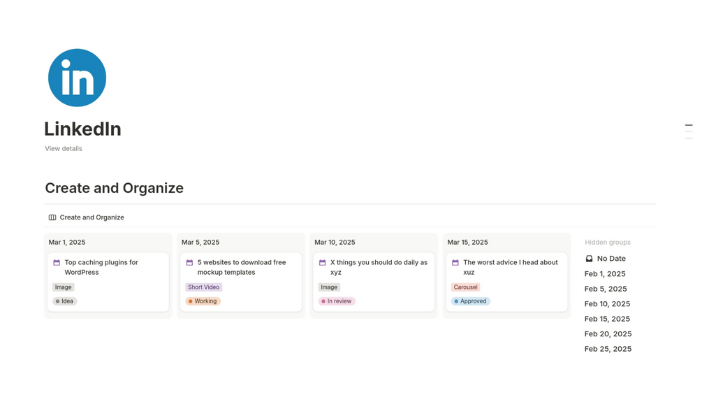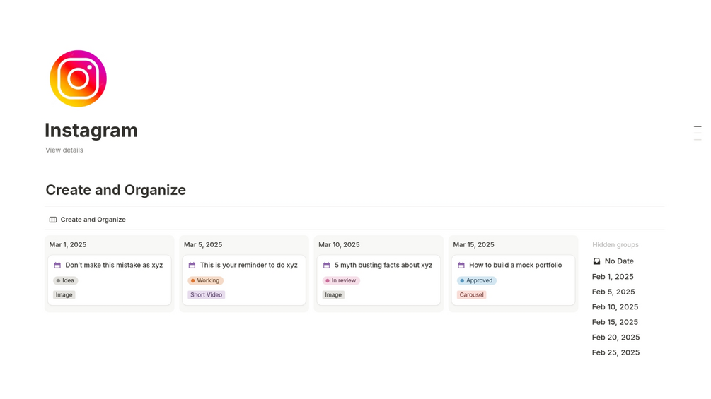 Organize content by status (idea, working, scheduled, published), type (image, text, video, carousel, article, etc.), channel (Instagram, X, Facebook, etc.), Account (different social media accounts), and much more.